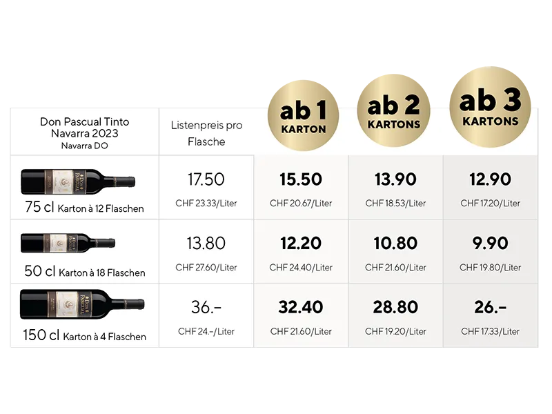 Zusätzlich ab 3 bestellten Kartons erhalten Sie eine Magnumflasche (150 cl) unseres Don Pascual Tinto Navarra 2022 im Wert von CHF 36.- geschenkt.